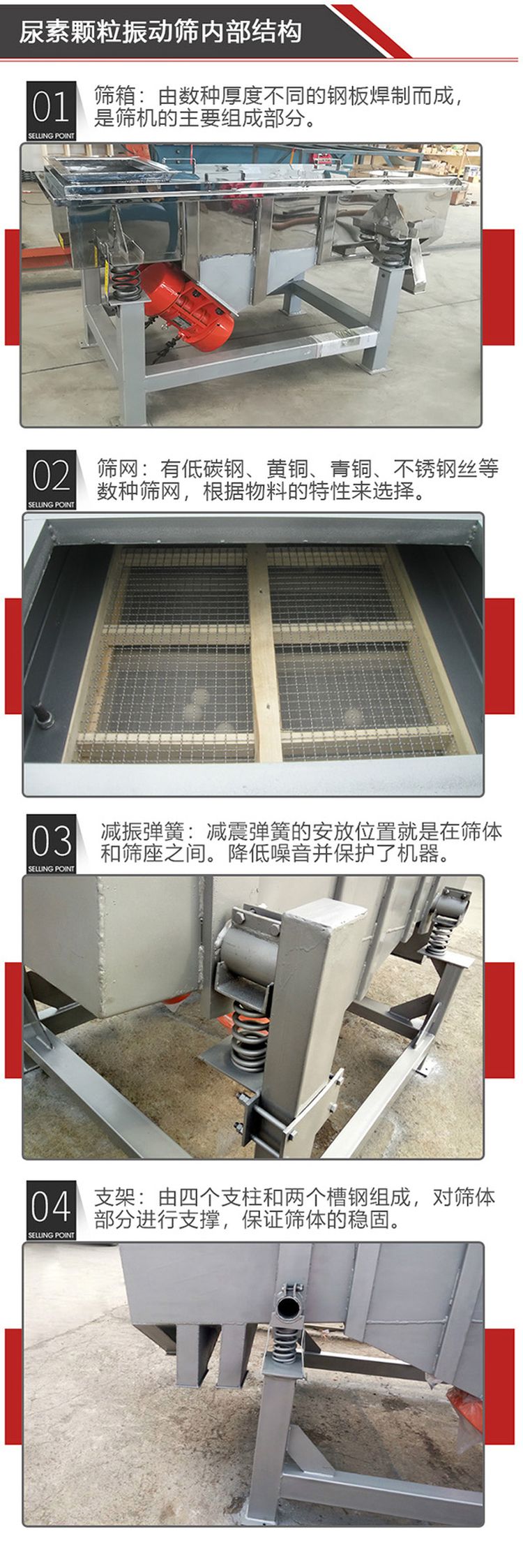 尿素顆粒振動篩主要由篩箱、篩框、篩網、振動電機、電機臺座、減振彈簧、支架等組成。